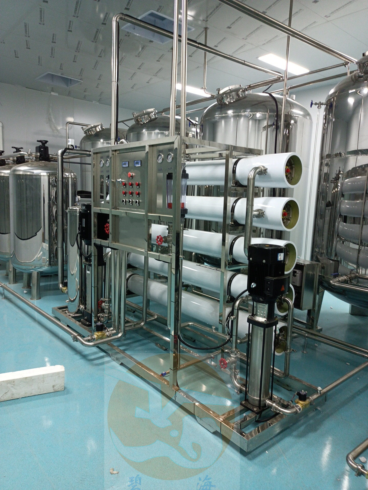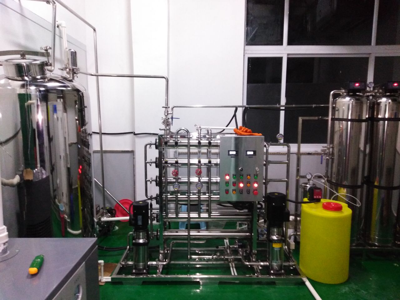 原水-原水加压泵→多介质过滤器→活性炭过滤器→软水器→精密过滤器→一级反渗透机→中间水箱→ 中间水泵→EDI系统→纯化水箱→纯水泵→紫外线杀菌器→微孔过滤器→用水点